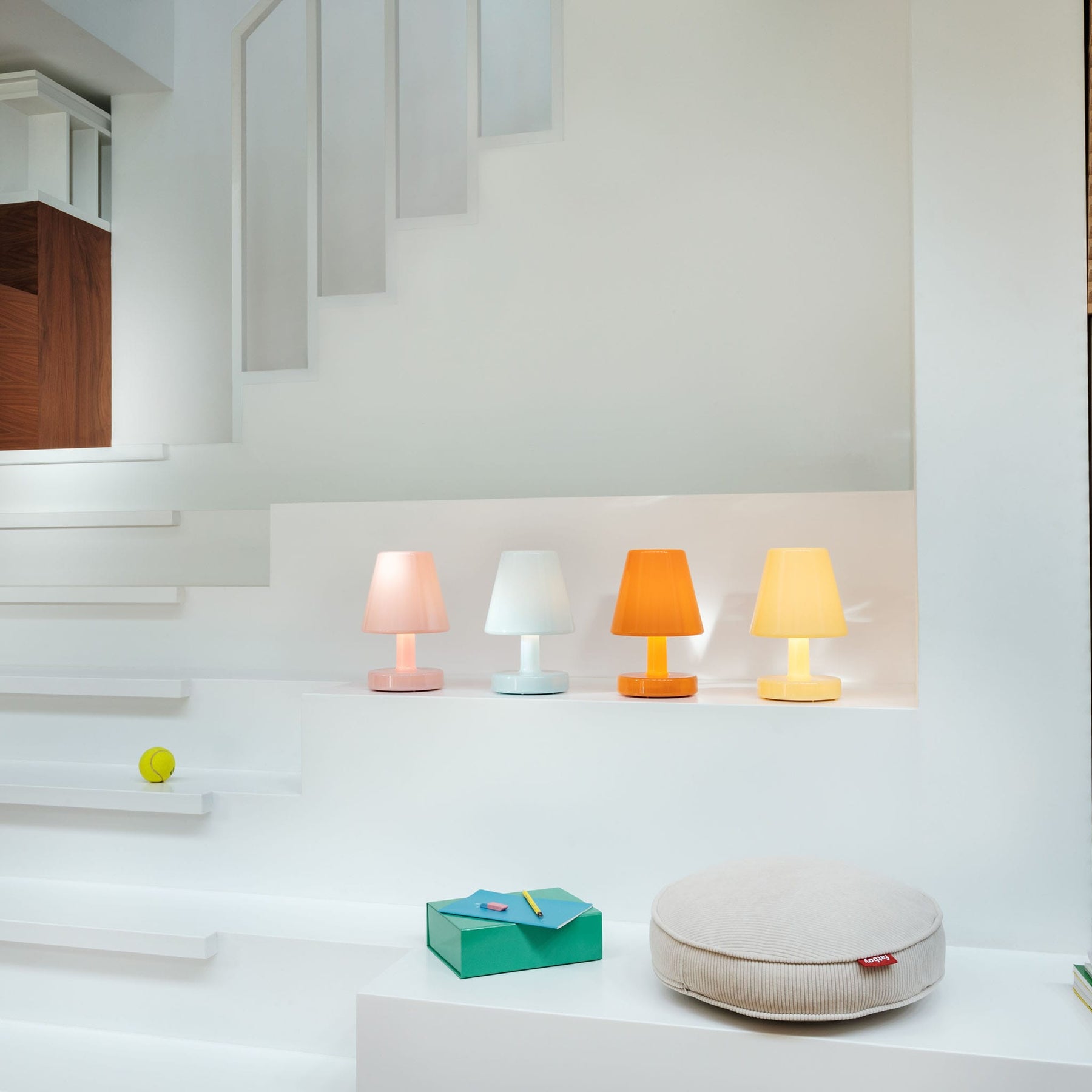 Rechargeable, wireless, and lightweight, Edison the Ambiance offers up to 24 hours of light on a full charge. Its durable polycarbonate shell is built for everyday use, while subtle details like the tone-on-tone Fatboy logo add a refined finishing touch. A small lamp with a big impact on ambiance.