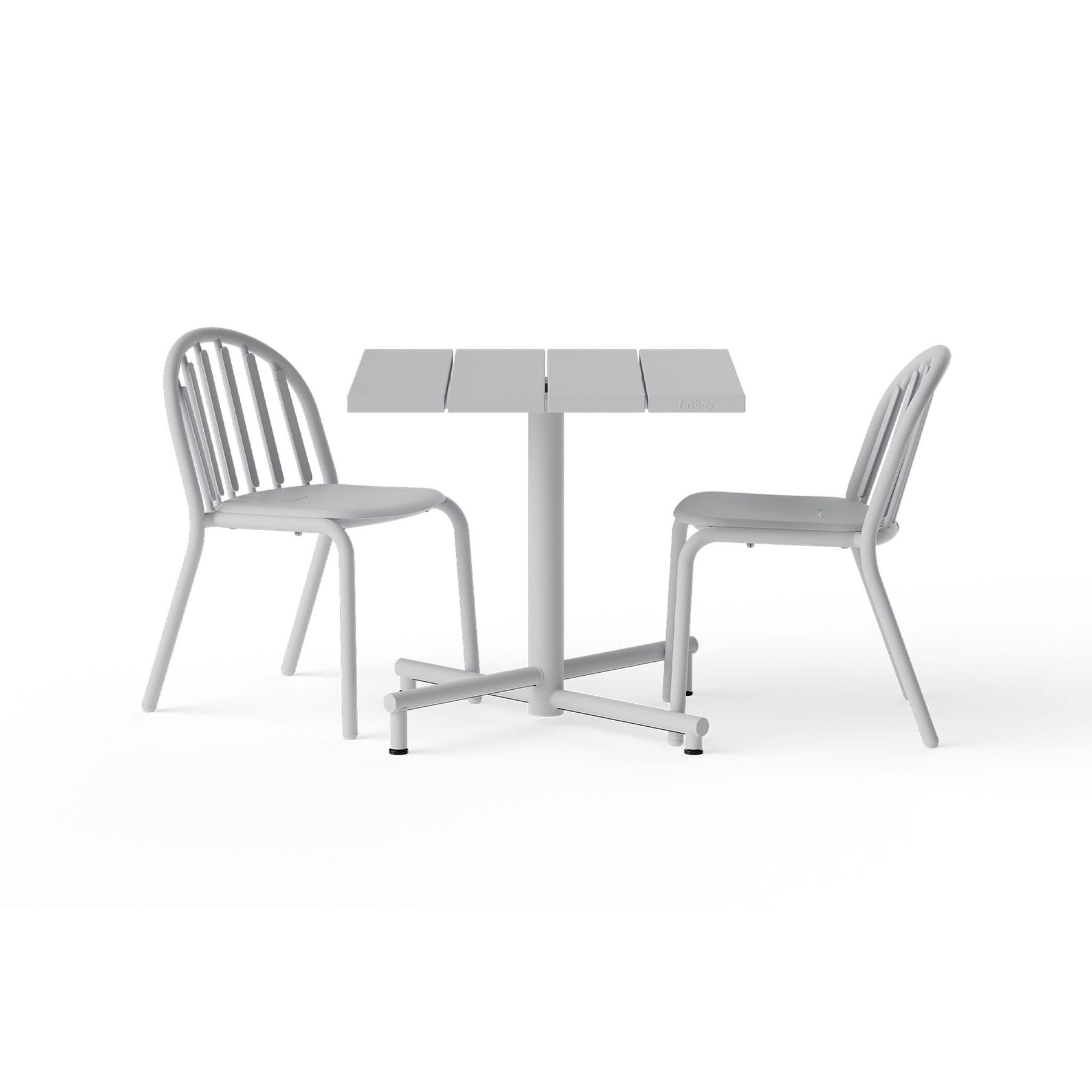 An outdoor bistro set in light grey with an 80×80 cm square table and two stackable chairs, designed for everyday outdoor use.