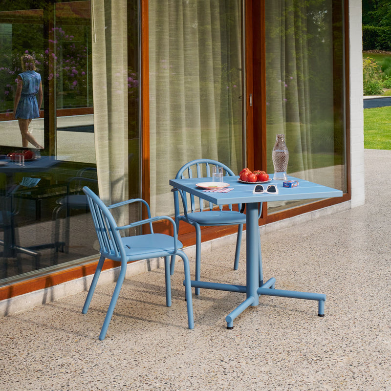 Two matching Fred’s chairs complete the set, crafted from lightweight aluminum that’s both sturdy and weather-ready. Their ergonomic silhouette includes a softly curved seat and flat back slats for comfortable seating, while the signature smile-shaped cutout allows water to drain quickly after rainfall. When not in use, the chairs stack neatly to save space.