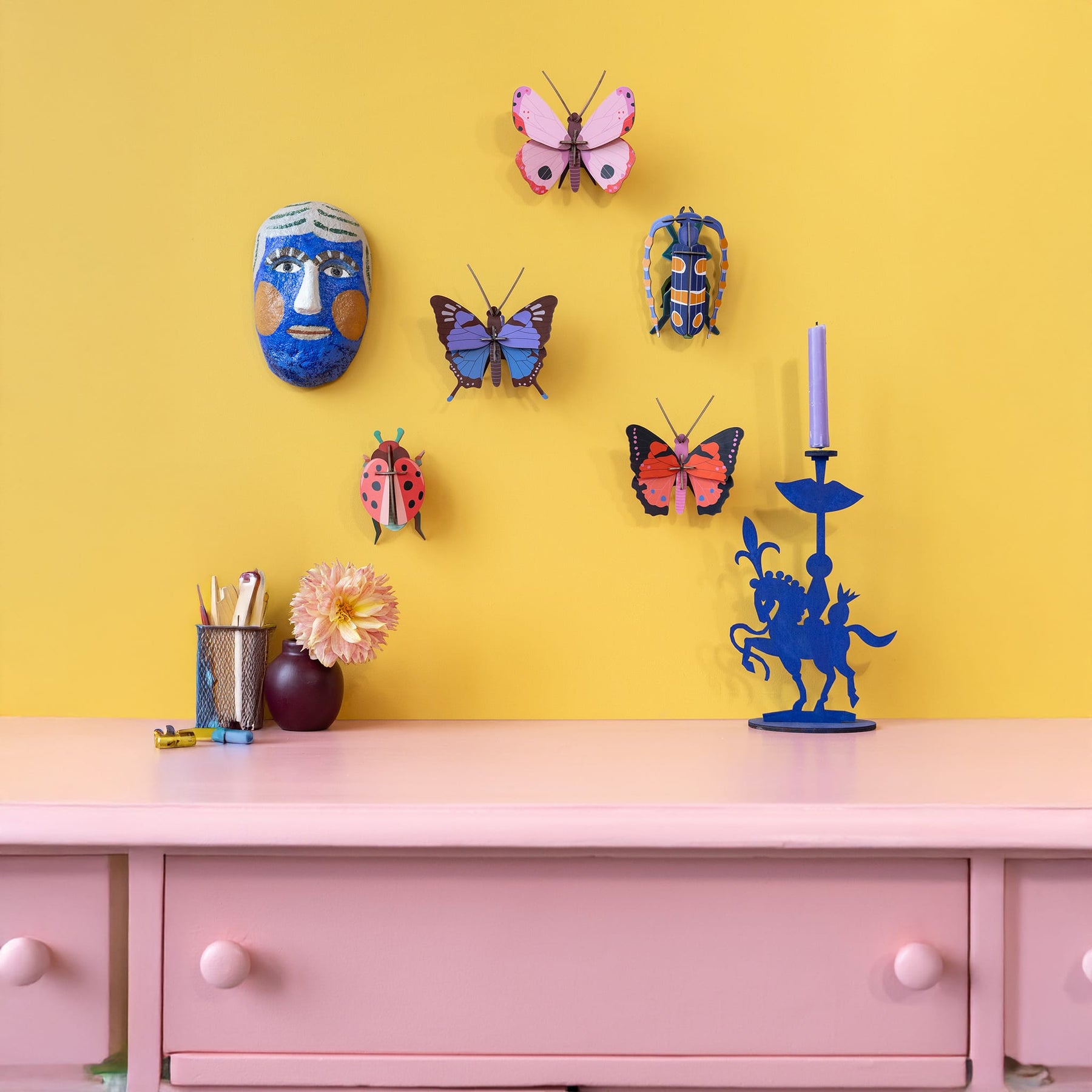 Printed on recycled cardboard using vegetable inks, this colourful butterfly features bright patterns and a sculptural presence. Delivered flat-packed, it is easy to assemble and becomes a striking accent for walls, shelves, or creative spaces.