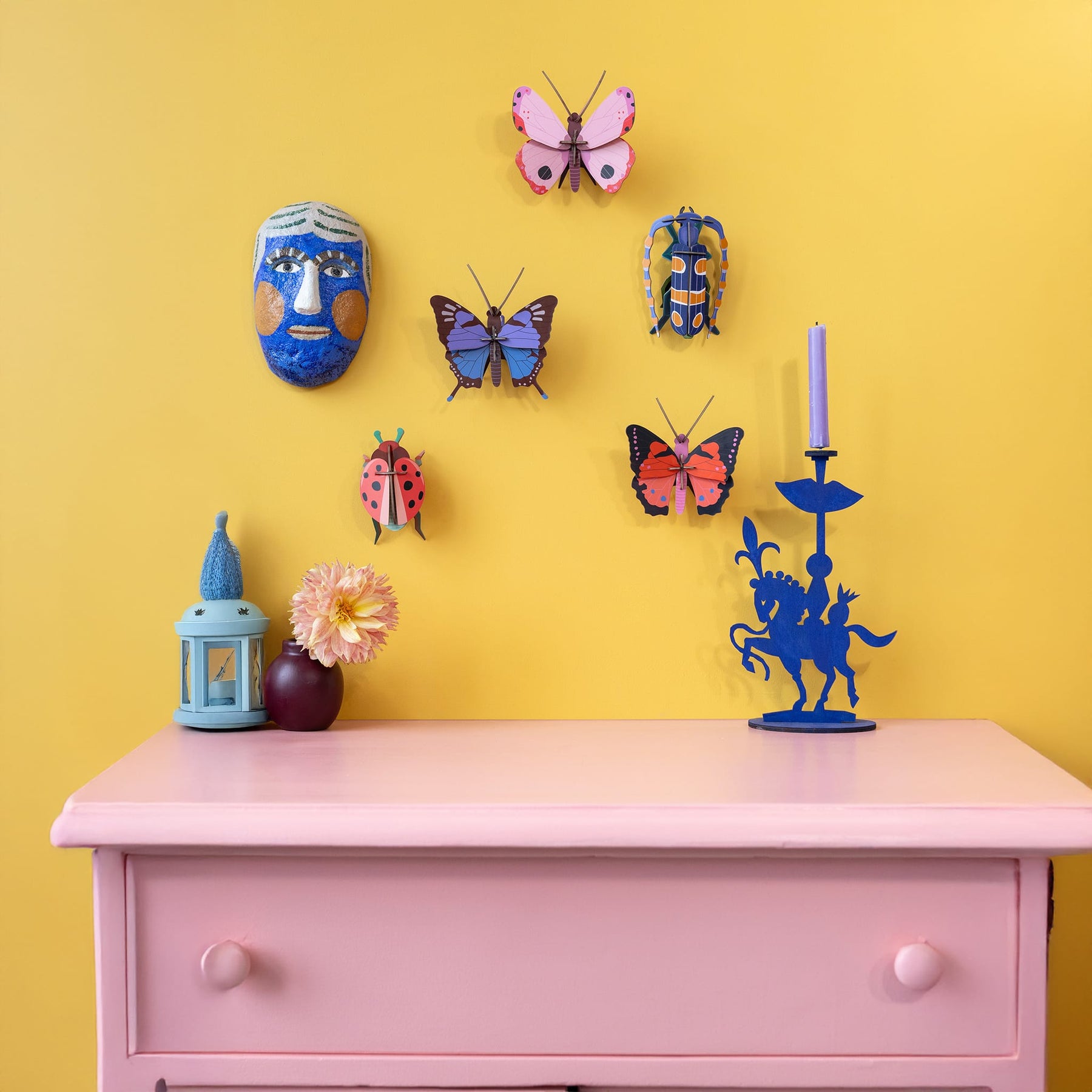 Printed on recycled cardboard using vegetable inks, this colourful butterfly features bright patterns and an expressive presence. Delivered flat-packed, it is easy to assemble and becomes a striking accent for walls, shelves, or creative displays.