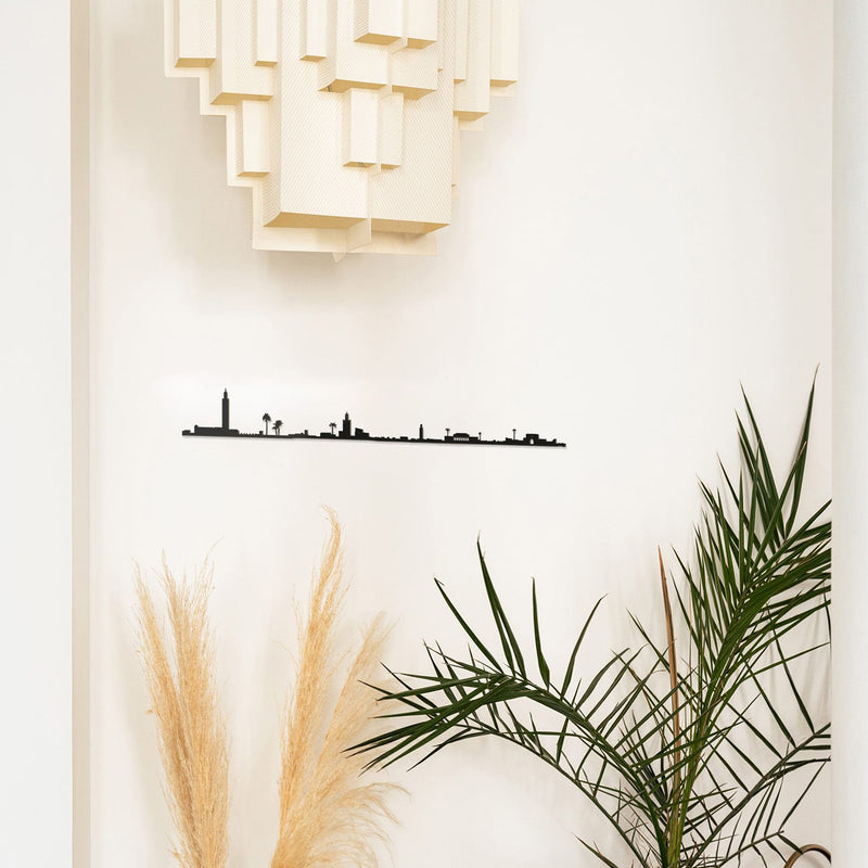 The Marrakech Line art piece presents the city’s silhouette as viewed from the south. This steel artwork highlights the emblematic Koutoubia Minaret surrounded by its gardens, the lively Jemaa el-Fna Square, as well as the architectural treasures of the Bahia Palace and the historic El Badi Palace. Each detail reflects Marrakech’s rich history and vibrant culture.